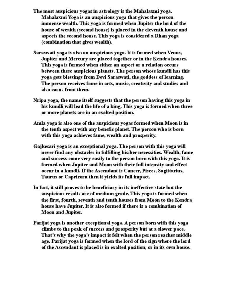 Auspicious Yogas In Kundli Calculator : 30 pages pdf report which includes your varshphal kundli, your varshphal prediction month wise and various yogas formed in the varshphal horoscope and their effects.