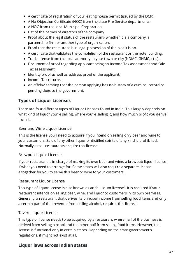 10 Legal Licenses Required To Start A Food Business In India So you should first contact the local authority to find out about alcohol laws and the sale of license in your states.