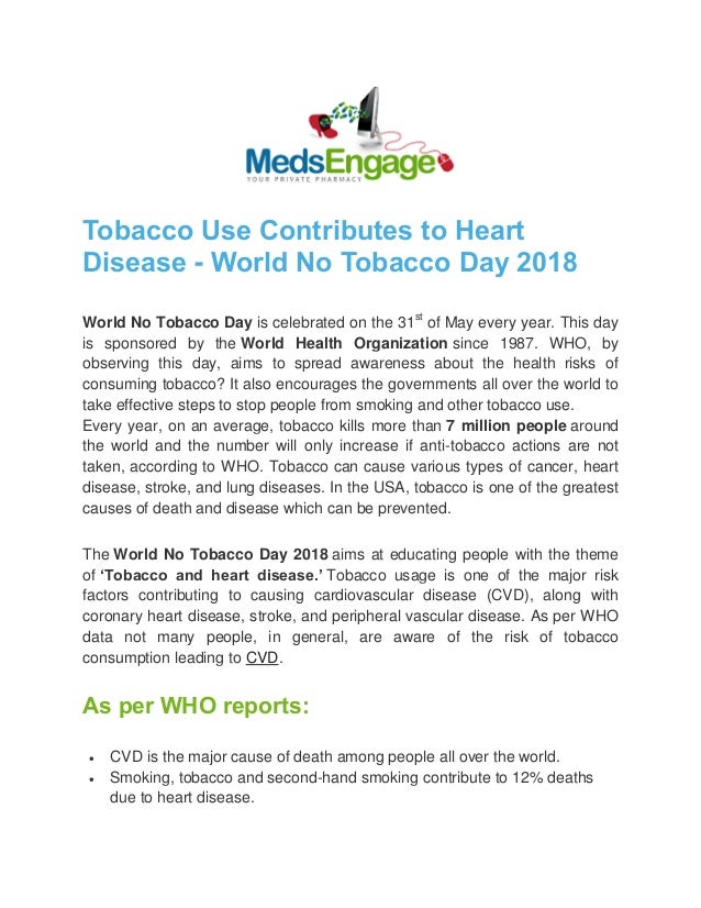 Tobacco Use Contributes To Heart Disease World No Tobacco Day 2018 World no tobacco day (wntd) is organized every year on may 31 to highlight the health and other risks associated with tobacco use, and advocating for effective policies to reduce tobacco consumption the focus theme of world no tobacco day 2018 is tobacco and heart disease.